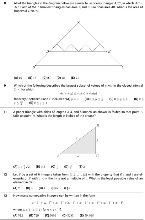 AMC 12涵盖了高中时学到的所有数学知识,包括三角学、高等代数、高等代数和部分微积分。
