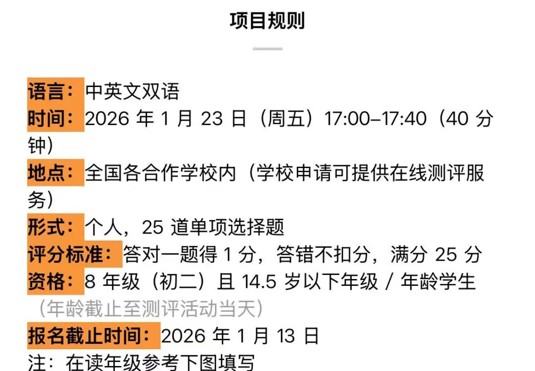 2026年考试时间为1月23日下午5点,可在合作学校或选择线上参加,报名截止到1月13日。