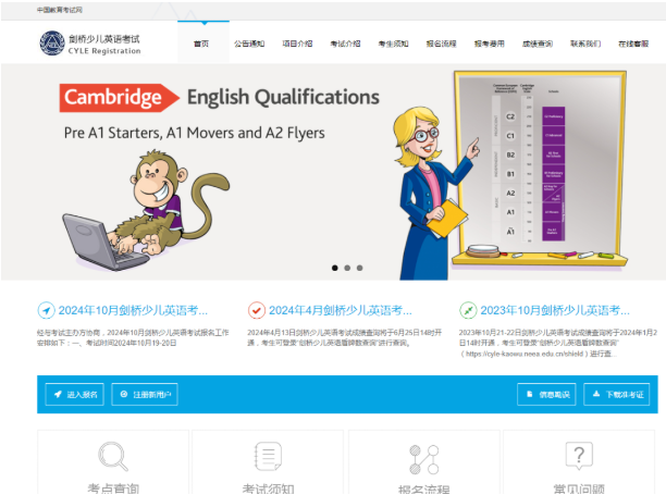 通过中国教育考试网进行报名时,家长可访问教育部教育考试院剑桥少儿英语报名官方网站,网址为:https://cyle.neea.cn/。随后根据具体需求进行相应的报考项目选择及费用支付。