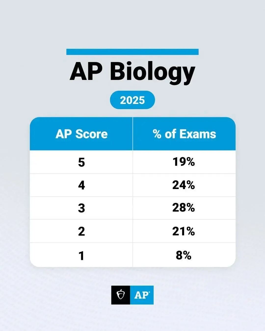今年AP生物的数据非常可观:学生对内容的掌握程度显著提升,5 分的比例从去年的 16% 上升到 19%,3 分及以上分数的比例从 68% 上升到 71%。