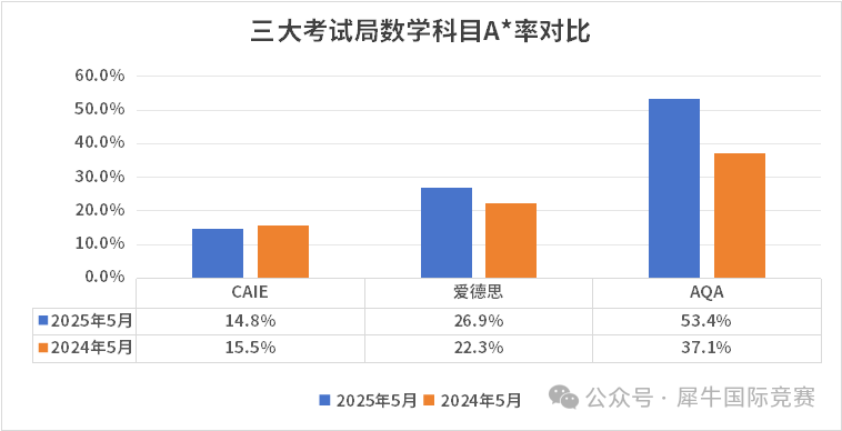AQA考试局的A*率明显高于CAIE和爱德思考试局的同期,尤其是今年夏季大考,AQA数学A*率猛涨16.3%达到了惊人的53.4%,同比CAIE考试局高出了近40%。
