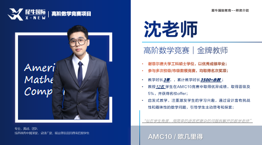 教学时长 4年 ,累计教学时长 6000+小时,熟悉AMC等各类国际数学竞赛;