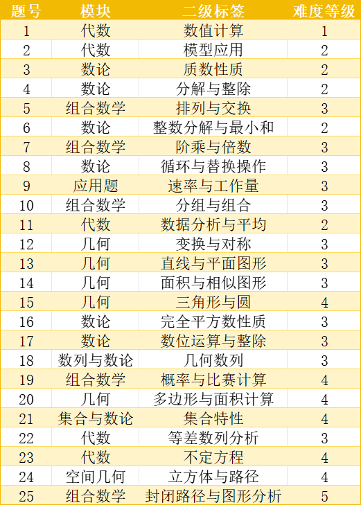 以最近的2024年AMC10竞赛真题为例,在知识分布上,数论部分的考查比重较往年明显增加,涵盖了质因数分解、模运算、平方数等核心知识点;几何内容的考查相对较少,相似三角形、圆以及立体几何等常见考点均未涉及;代数部分也没直接考一次函数和二次函数,整体难度较为平缓。