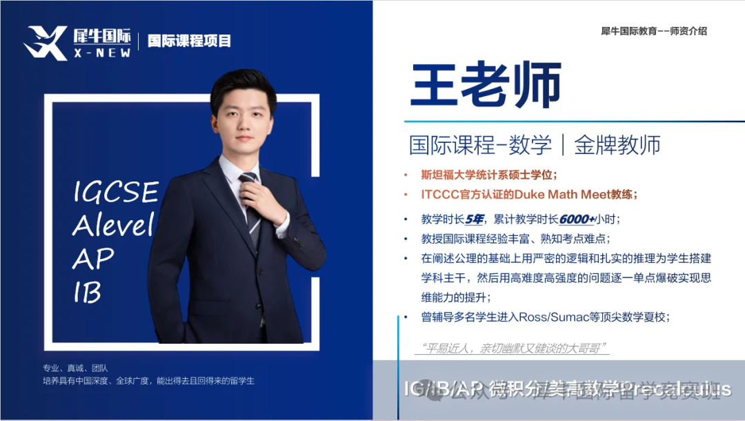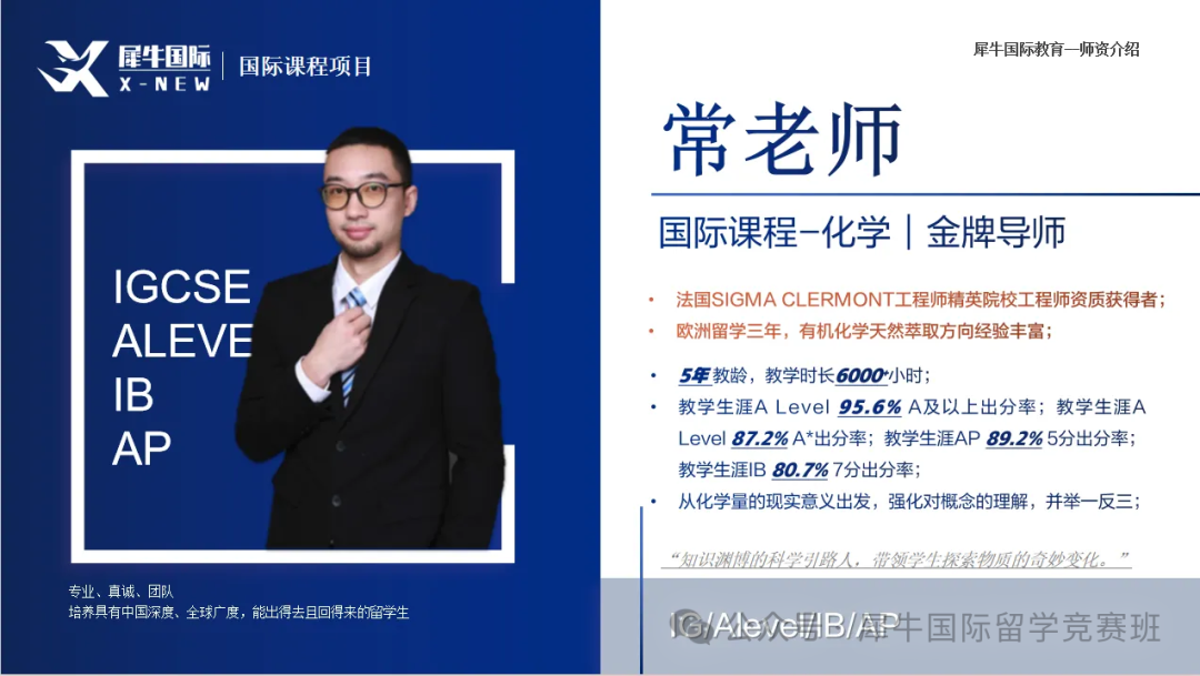 犀牛教育IGCSE课程师资团队实力雄厚,授课教师均来自海内外top名校,有非常丰富的教学经验,老师们常年深耕于国际学科体系,对于国际学校的考纲教程了如指掌,不仅能够精准把握核心考点,还能满足不同学生的需求,助力学生冲击名校。