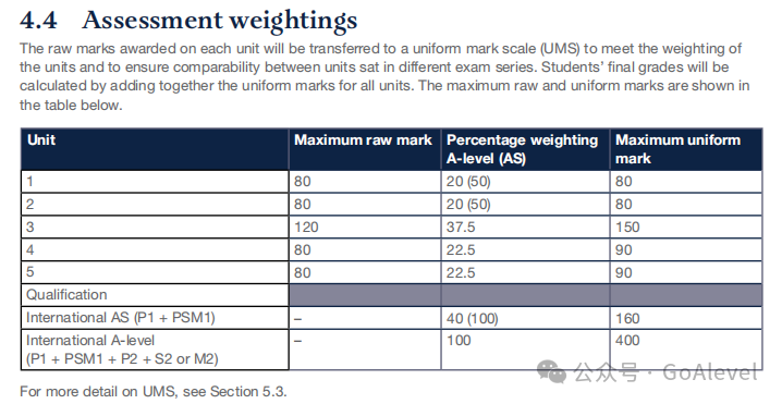 A-LEVEL的学习是分为AS和A2.因此,它会有一个合分的情况,而且它在合分时AS成绩占40%,而A2成绩占60%,考试大纲中会详细说明每个部分的占比以及每张试卷换算UMS分数是多少等。即使是卷面分,也是先转换为UMS分数,然后根据大纲中的规定进行调整,最后将这些分数相加,以确定是否符合A*或A等级的要求。