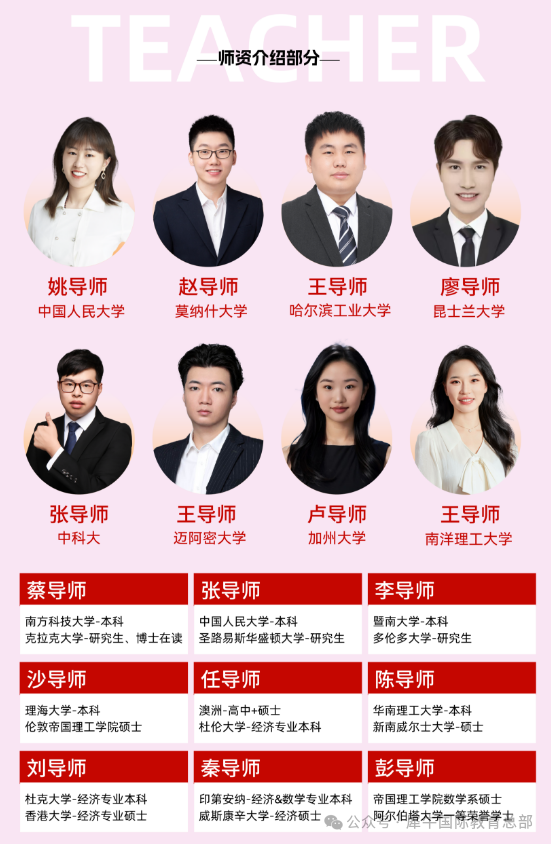 我们的老师均来自海内外名校:中国人民大学、南洋理工大学、帝国理工学院等,老师们授课经验丰富,熟知国际竞赛命题规律,能很好的帮助同学们在考试中取得好成绩。