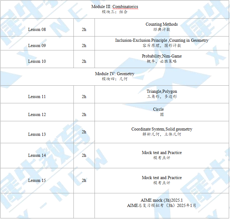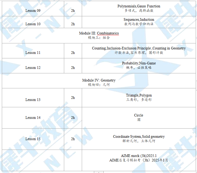 课程内容:帮助考生补充至AMC12水平(三角函数、复数、向量),再培养学生的解题能力和创新思维。熟悉了解其命题风格,再进行针对性的查缺补漏和提高。
