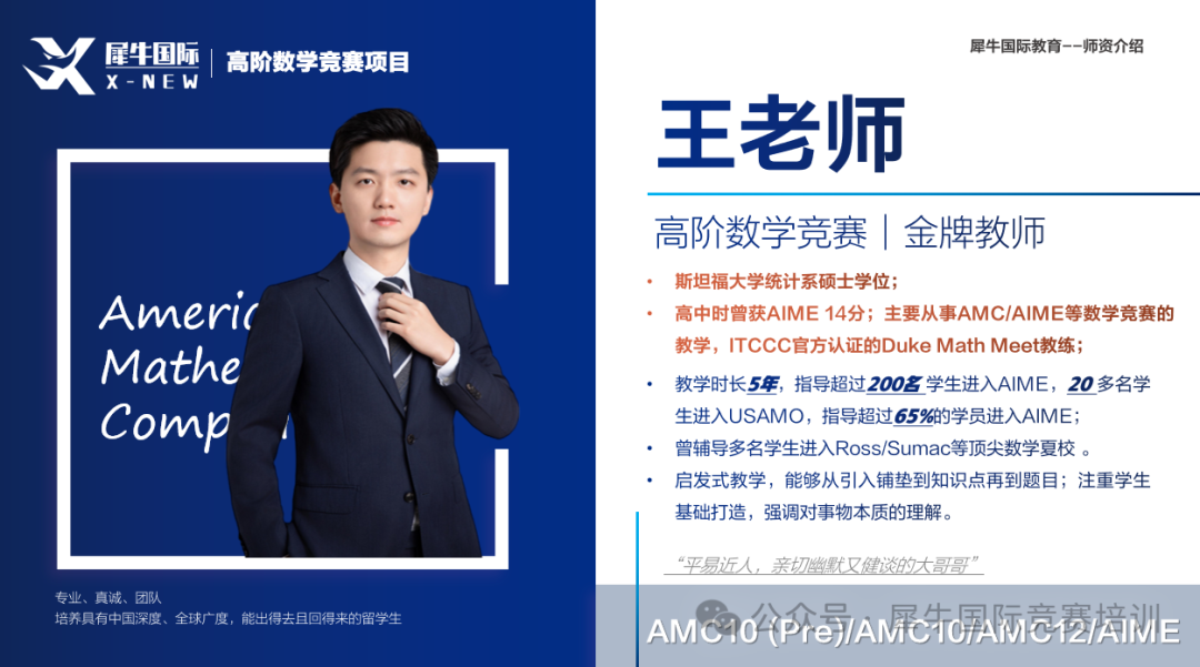 高中时曾获AIME 14分;主要从事AMC/AIME等数学竞赛的教学,ITCCC官方认证的Duke Math Meet教练;