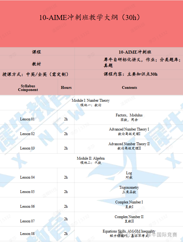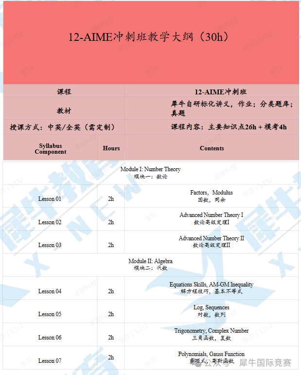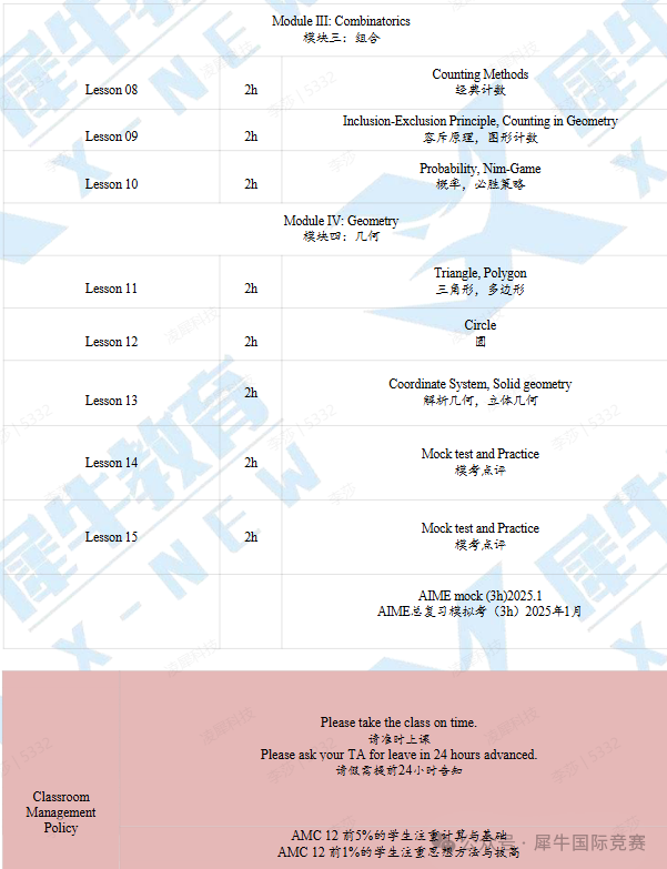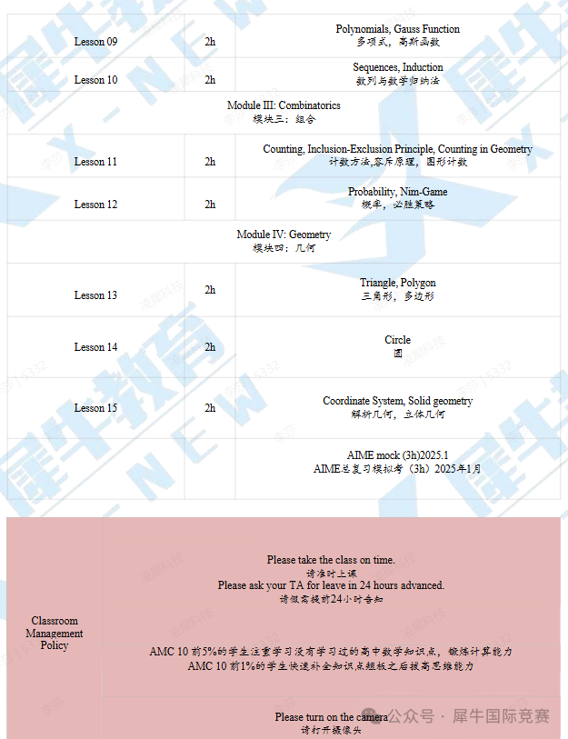 ✦课程内容:帮助考生补充至AMC12水平(三角函数、复数、向量),再培养学生的解题能力和创新思维。熟悉了解其命题风格,再进行针对性的查缺补漏和提高。