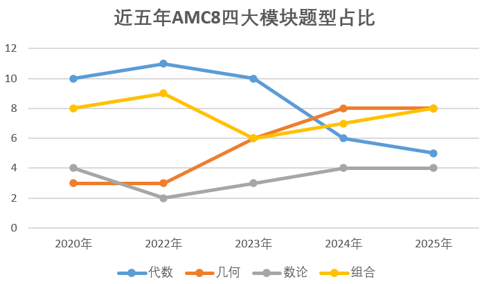 这表明AMC8的出题趋势是,由单一的代数为主导转变为多个模块综合考察,对考生的综合应用能力和知识点的平衡掌握能力要求提高。