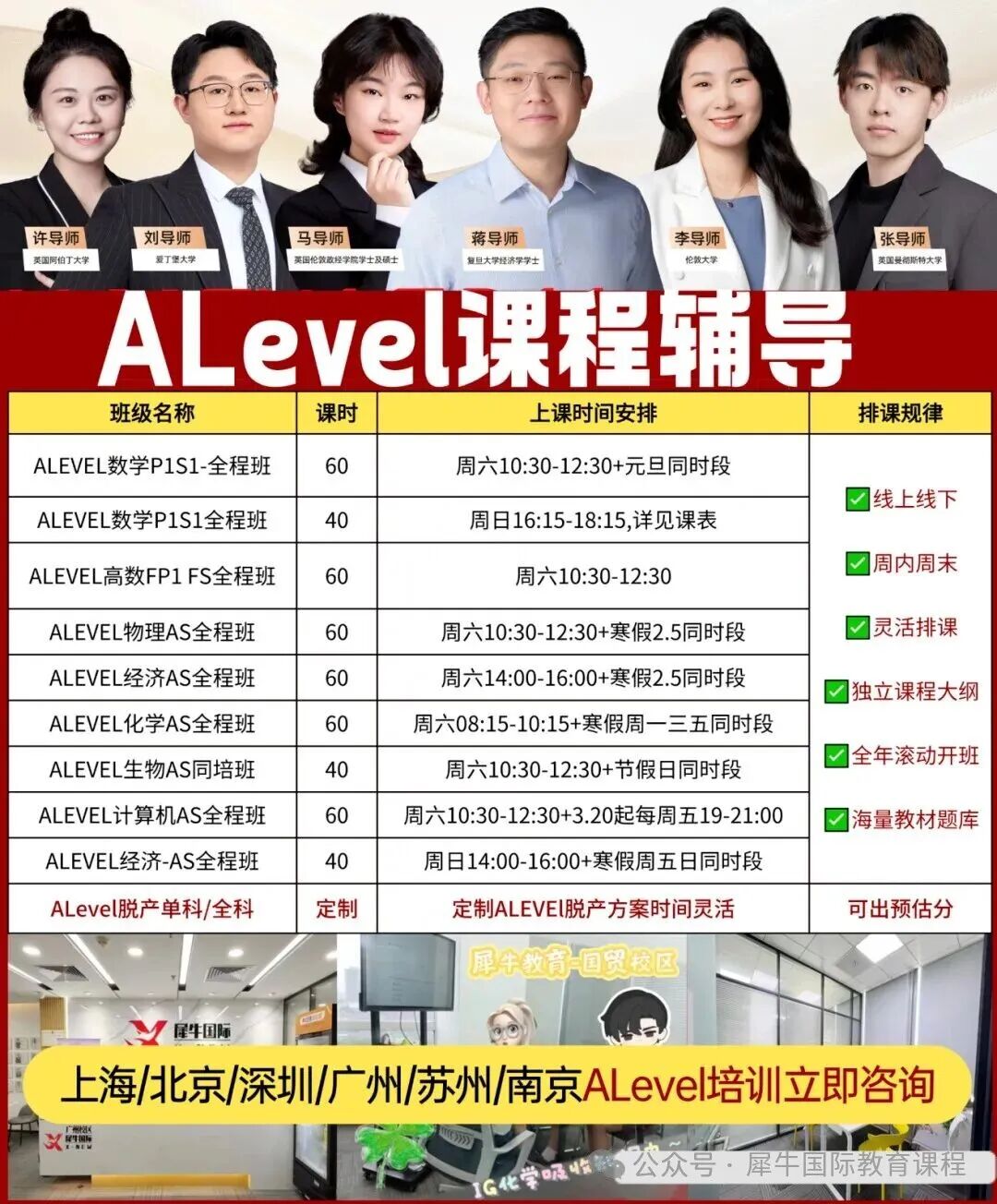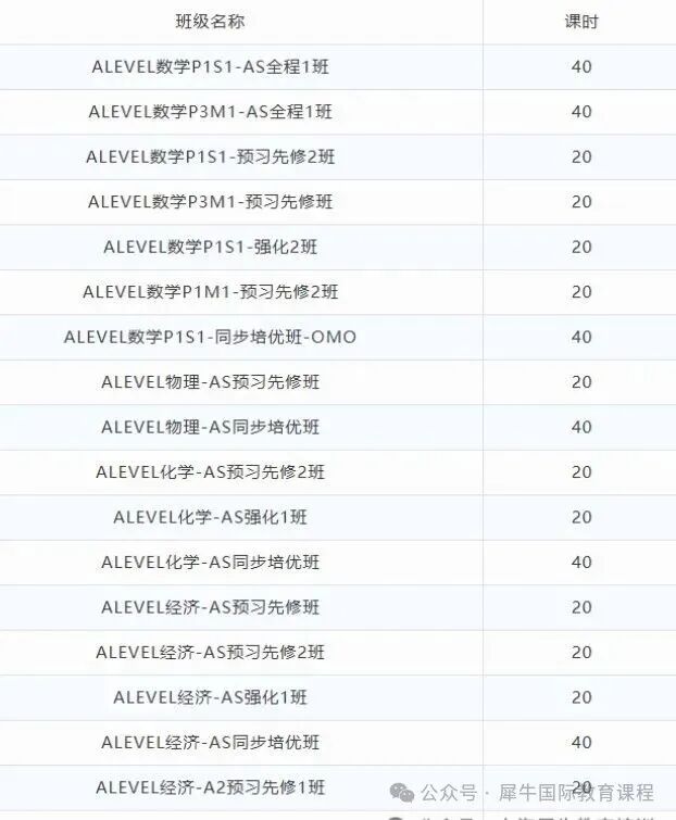 犀牛国际教育针对计划申请英国或者其他英联邦方向高校,准备或正在学习A-Level课程体系的学生,根据学生的不同基础,开设了数学、物理、化学、生物、经济、计算机等科目的个性定制化辅导课程,线上线下同步开课。