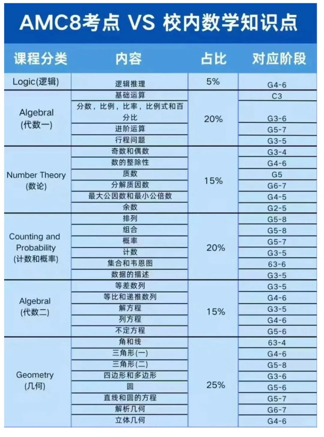 以AMC8为例:考察内容涵盖从小学基础到初中七年级的数学知识,包括代数、几何、数论和组合数学等多个领域。