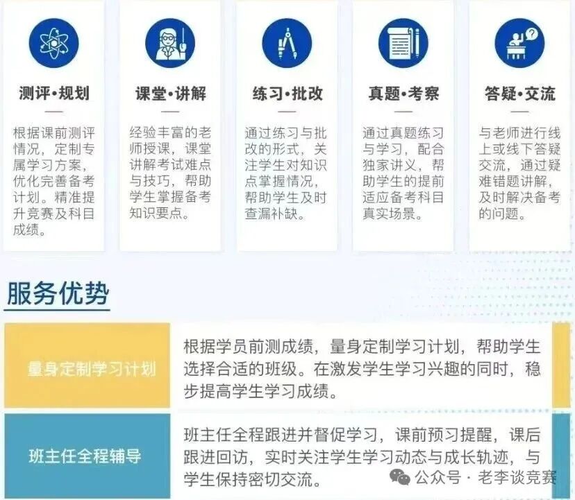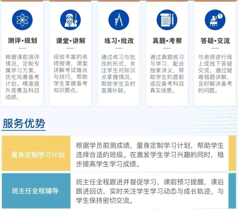 班主任+助教+学管+授课老师四位一体,测评规划、课前提醒、课中精讲、课后答疑、阶段检测,并且为在学学员 提供AMC8免费代报名,备考无忧~