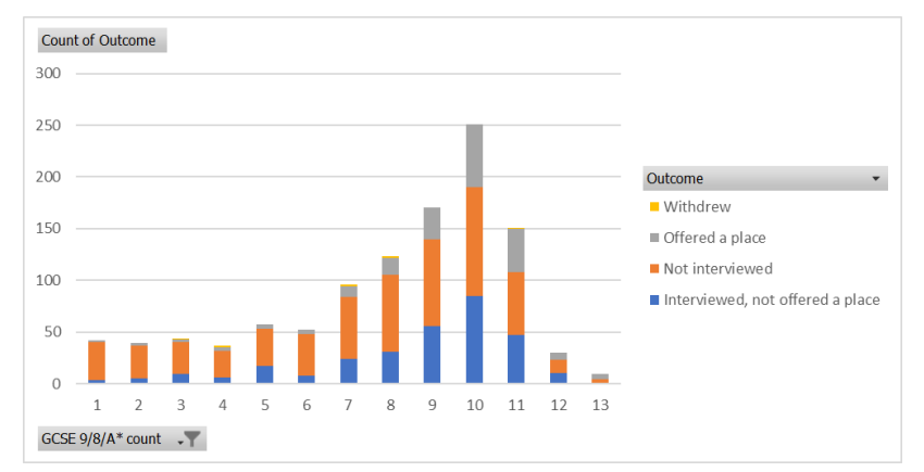通过报告的图表可以看到,GCSE或IGCSE的A*成绩越多,进入面试和录取的概率越大,录取者普遍拥有 9-11门 A* ,而只有 1–3 门A* 的申请者,几乎都没有进入面试的机会。
