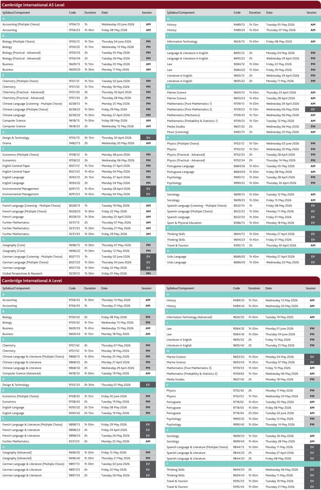 A-Level考试时间:2026年5月5日-2026年6月12日