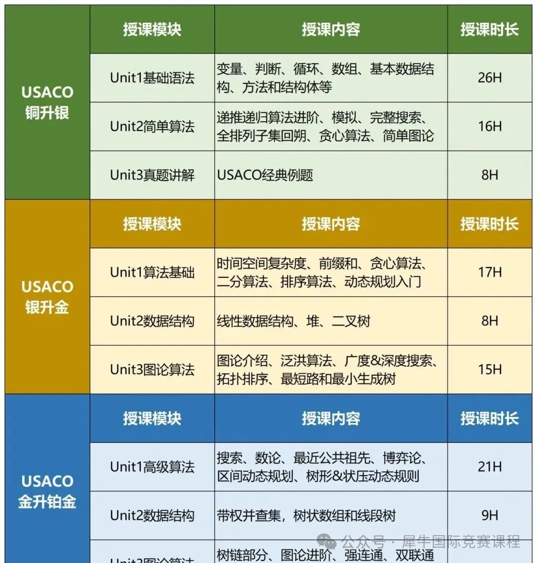犀牛国际USACO竞赛培训课程,针对不同基础的学生都有开设课程,包含铜升银、银升金、金升铂金等,轻松晋级,拿下金奖。USACO培训课程覆盖铜升银、银升金、金升铂金全路径 ,目前3-8人小班课,有专属前测定位学生基础,规划适合备考方案~