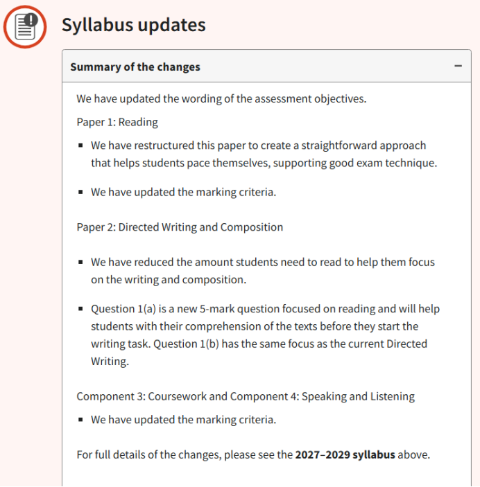 CAIE考试局对0500 EFL 2027-2029年考纲的考试形式进行了微调,并且更新了评估目标的措辞,大纲具体调整如下: