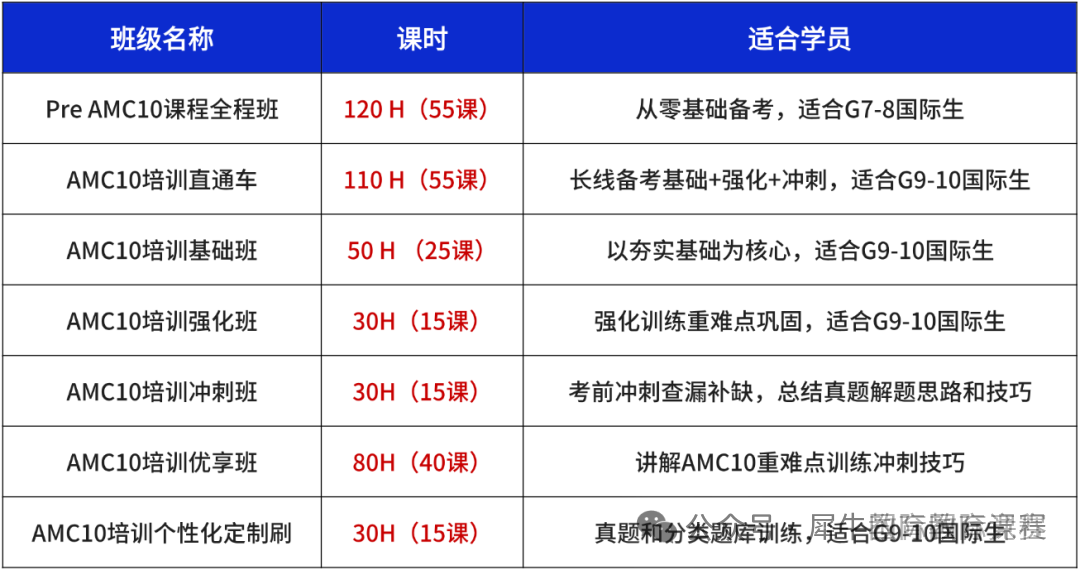 Pre阶段(补充代数基础)、Pre-AMC10基础段(全面梳理基础知识点)、Pre-AMC10强化段(分类题库学习)、Pre-AMC10冲刺段(刷题模考)!长线扎实备考。