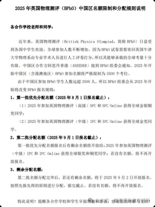 然而,BPHO新规则宣布:自2025年起,中国区BPhO参加名额将严格限制为3500 个考位。与此同时,BPhO报名规则也将进行重大调整!