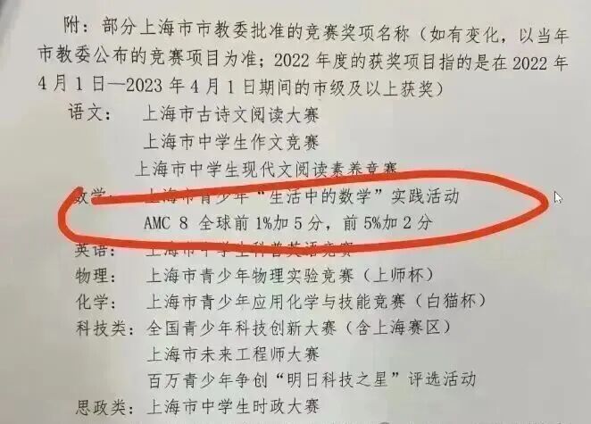 上海市教委将AMC8纳入小升初加分体系,全球前1%(约23分)可加5分,前5%(约18-20分)可加2分。