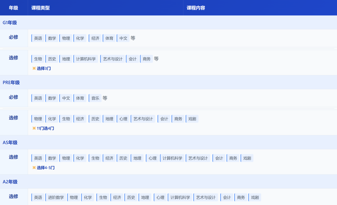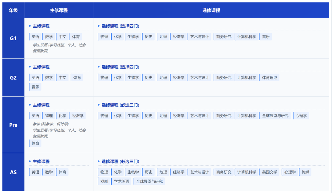 学制四年,依次设 G1、G2、A1、A2 四阶:G年级平均修习8–10门,A年级主修核心4–5门。