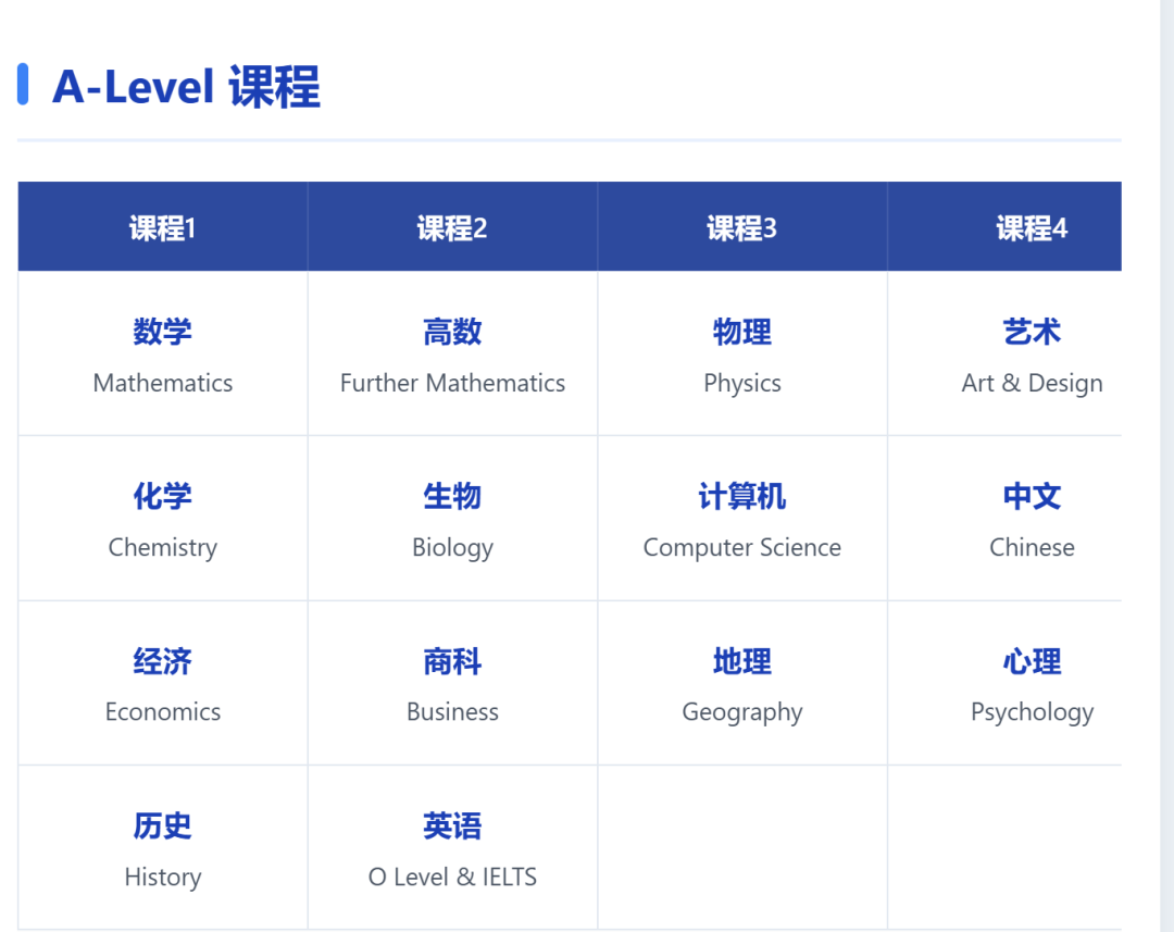 数学、进阶数学、物理、化学、生物、计算机、经济、商务、心理学、历史、地理、艺术、中文、英语——常规 A-Level 科目全覆盖。