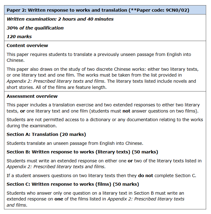 学生必须就附录2:规定的文学文本和电影中列出的一篇或两篇文学文本写一份回应。如果学生回答了两篇文学文本的问题,则他们没有完成C部分。