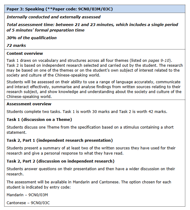 基于录音的听力评估,以男性和女性中文使用者为对象。学生将根据各种背景和来源回答理解问题,口语中文录音将以普通话和粤语提供。