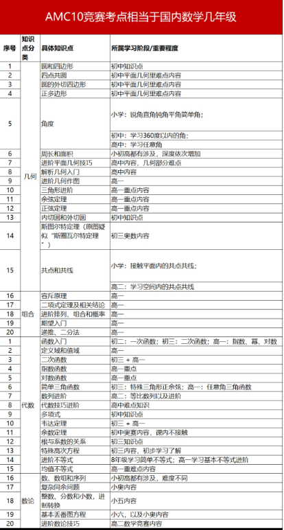 AMC10数学竞赛考试涵盖初三和高一数学课程内容,难度高于国内一般中学水平,相当于初中数学联赛。代数、几何、数论、组合四大模块拆分,知识点覆盖初二到高二。