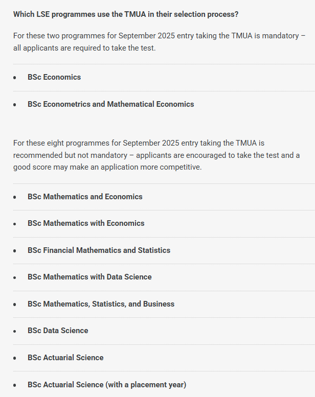 根据最新申请指南,LSE对于申请人的入学考试要求有所增加。除了经济学、计量经济学和数理经济学专业必须参加TMUA考试外,统计系相关专业也将TMUA考试纳入录取考察范围。