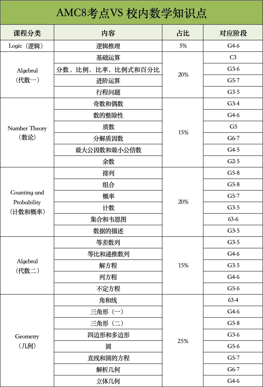 AMC8数学竞赛竞赛考点:代数、几何、应用、计算。涵盖小学全阶段数学知识,并延伸至部分初中内容。