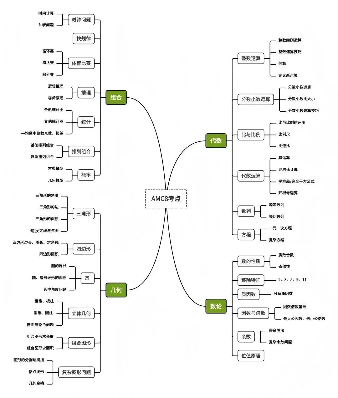AMC8考点可分为代数、几何、数论、组合四大模块,考察范围主要包含三个模块:小学五六年级数学知识+少部分初中数学知识+校内不会学的课外竞赛知识点数论、计数。