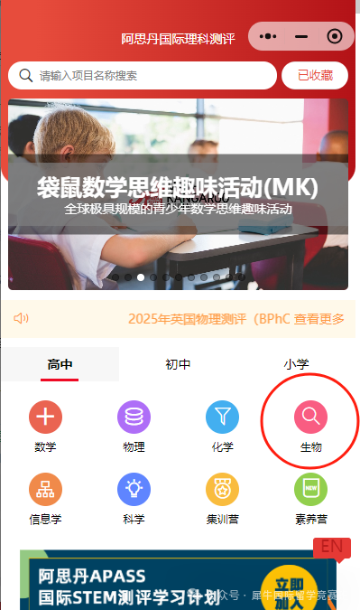 登录“阿思丹国际理科测评”微信小程序