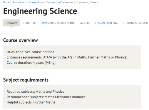 牛津大学、剑桥大学等顶尖高校官网显示,一些理科专业的申请都需要具备一份优秀的数学成绩,例如牛津大学的工程专业、剑桥大学的自然科学专业,都要求申请者数学取得A*的成绩。