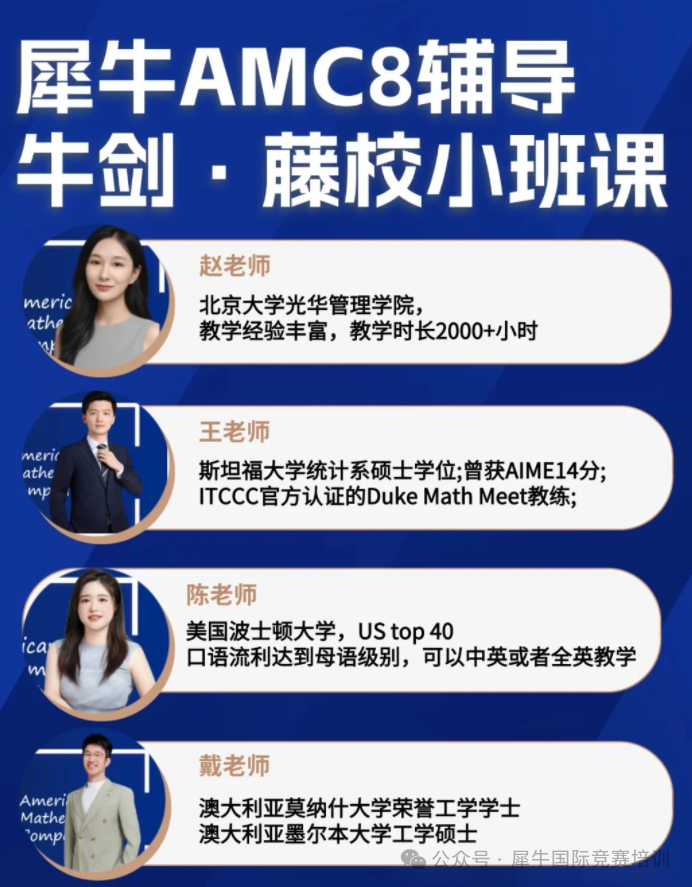 犀牛AMC课程针对备考AMC8竞赛的考生,有不同学习程度的辅导课程。针对3-8年级学生,犀牛特别开设Pre-AMC8和AMC8两大课程体系,帮助学生取得AMC8数学前5%的竞赛成绩。
