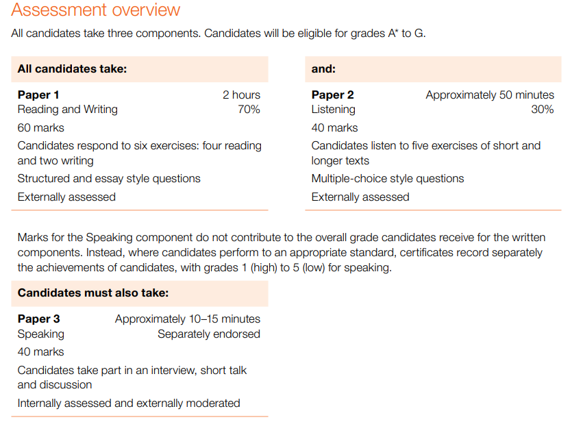 0510考3个paper,主要考察英语听、说、读、写四个方面。在笔试评估模块中,paper 1阅读及写作占总成绩的70%,paper 2听力则为30%。Paper3口语成绩单独记录,不计入总成绩。具体参考以下大纲: