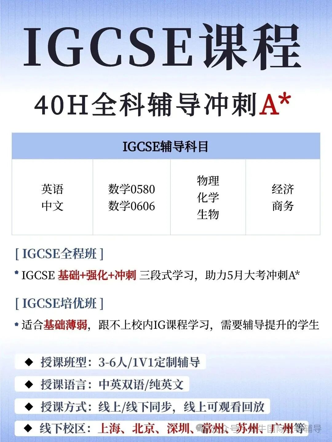 犀牛教育IGCSE课程辅导,全年滚动开班中!寒假正是集中备考冲刺的最佳时间,不管你是想突破高分瓶颈,还是想在短时间快速提升成绩,犀牛教育开设的IG课程寒假辅导都可以助你一臂之力!