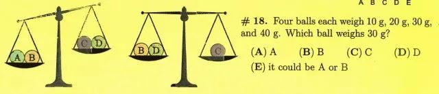 我们看下面这道3、4年级的题目,有4个球,分别是10g、20g、30g和40g,根据图里面的天平指示,问哪个球是30g?