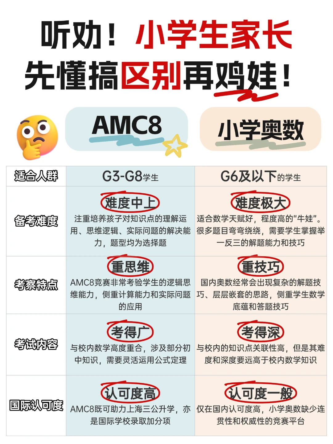 AMC8和奥数区别不仅体现在难度与内容,更在于教育理念与适合人群。对于3-6年级学生,AMC8更能激发兴趣、建立信心、稳步提升,是大多数家庭的更优选择。理解AMC8和奥数区别,就是为孩子选择更合适的起跑线。