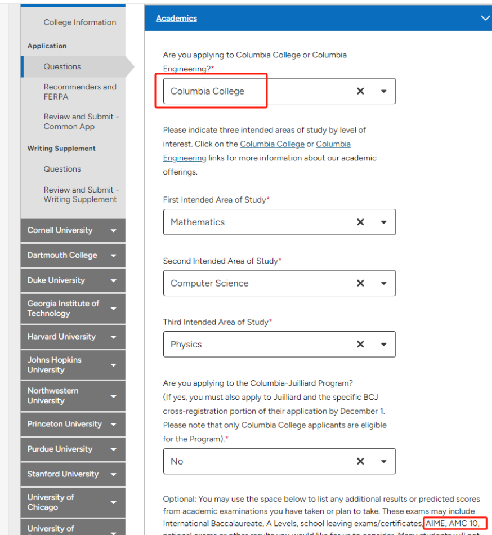 ▲Common App是美国大学最常用的申请系统之一,多个知名院校(如哥伦比亚大学、布朗大学等)在申请时询问到是否参加过AMC数学竞赛。