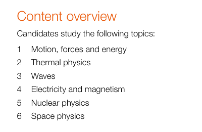 在CAIE的IGCSE 物理考纲中,常考的知识点包括:普通物理学,热物理学,波的性质,光学,电学,磁学,原子物理,天体物理等内容。