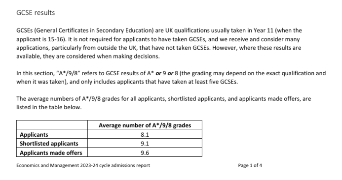 牛津、剑桥等G5院校虽未明确强制要求IG成绩,但申请者大多数拥有不错的IGCSE成绩,以牛津大学的Economics and Management专业为例,在Keble College发布的招生数据中显示,2023-24cycle所有申请者平均有8.1门GCSE达到A*/9/8等级;入围申请者平均有9.1门GCSE达到A*/9/8等级;录取学生平均9.6门GCSE成绩达到A*/9/8等级。