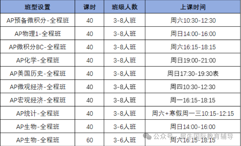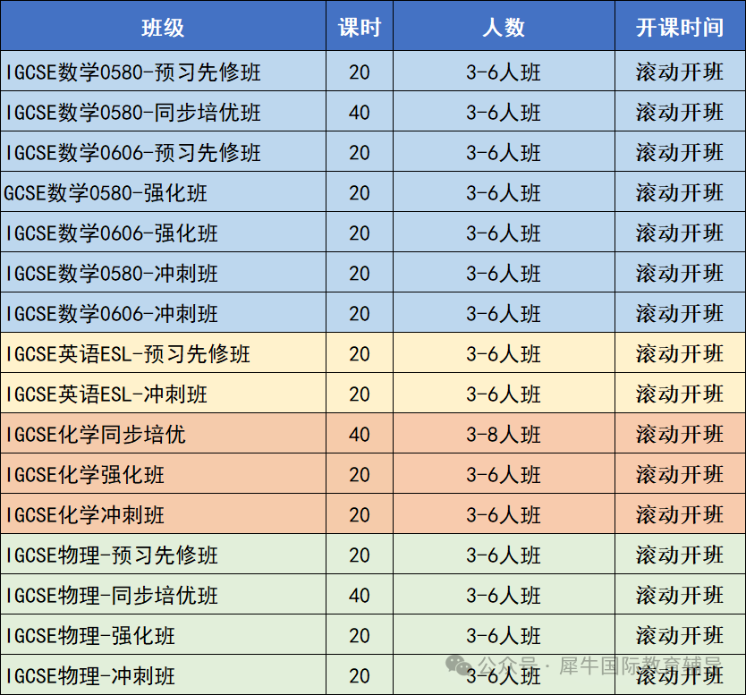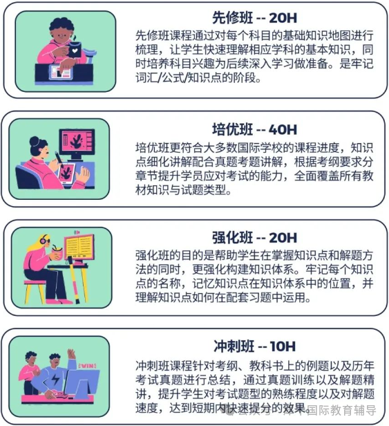 犀牛IIG/A-LEVEL/IB/AP寒假班有先修班,培优班,强化班和冲刺班,根据不同基础不同年级的学生和需求进行匹配,联系客服咨询课程详情~