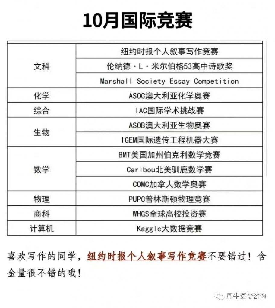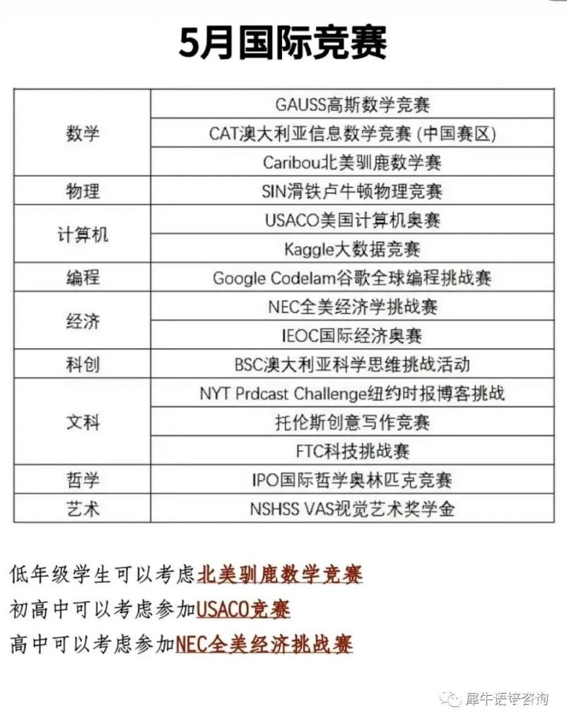 有统计数据说明:能被世界知名大学录取的同学,除了自身硬件成绩优异外,在软实力上基本上都会有丰富的课外活动,并至少一两项国际竞赛的金、银奖获奖经验。犀牛给大家整理了今年5-12月的国际竞赛,看看你想参加哪个?