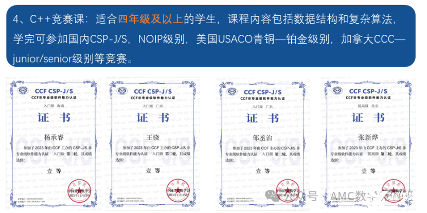 如果孩子逻辑思维强,5年级开始学习C++,5年级到初中重点可参加CSJ-j/s。