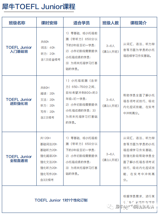 犀牛国际小托福课程包含小托福基础/强化/冲刺/全程班,课程内容涵盖听力、词法、辨音、阅读、写作、刷题演练等,3-6人小班教学/1V1辅导,线上线下同步授课,让每一位学员都能提到针对性的辅导。