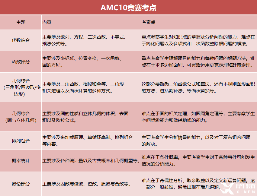 内容:各个章节基础知识点梳理,保证低年级学生掌握AMC10所涉及的考点,为后续备考打好基础。