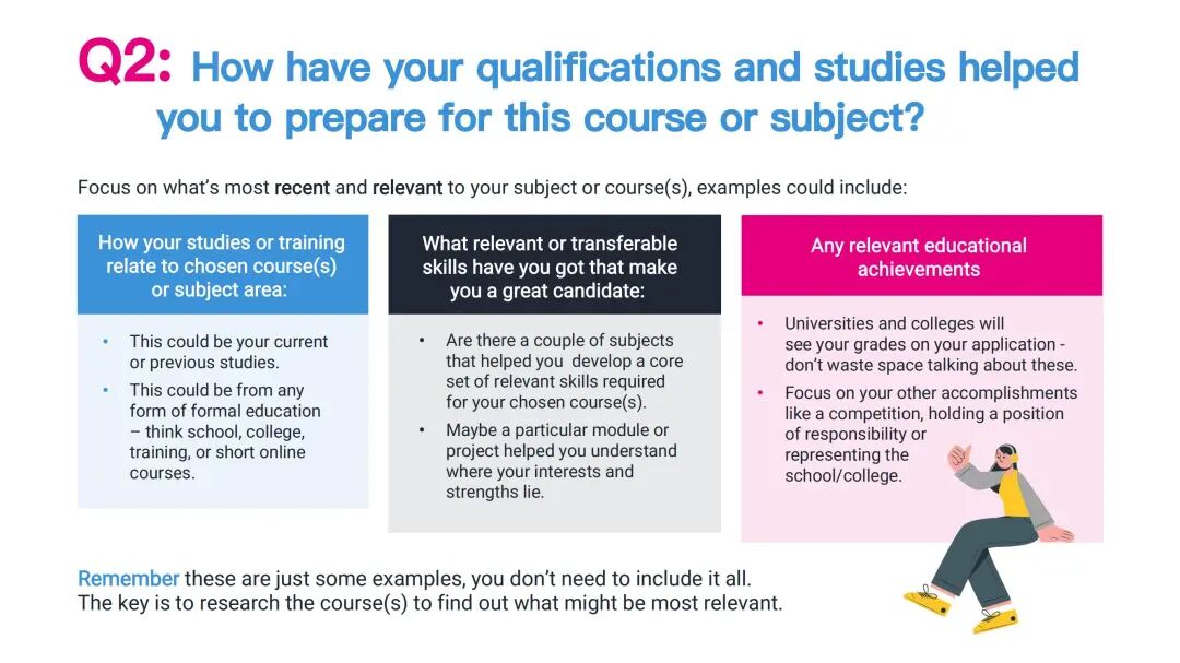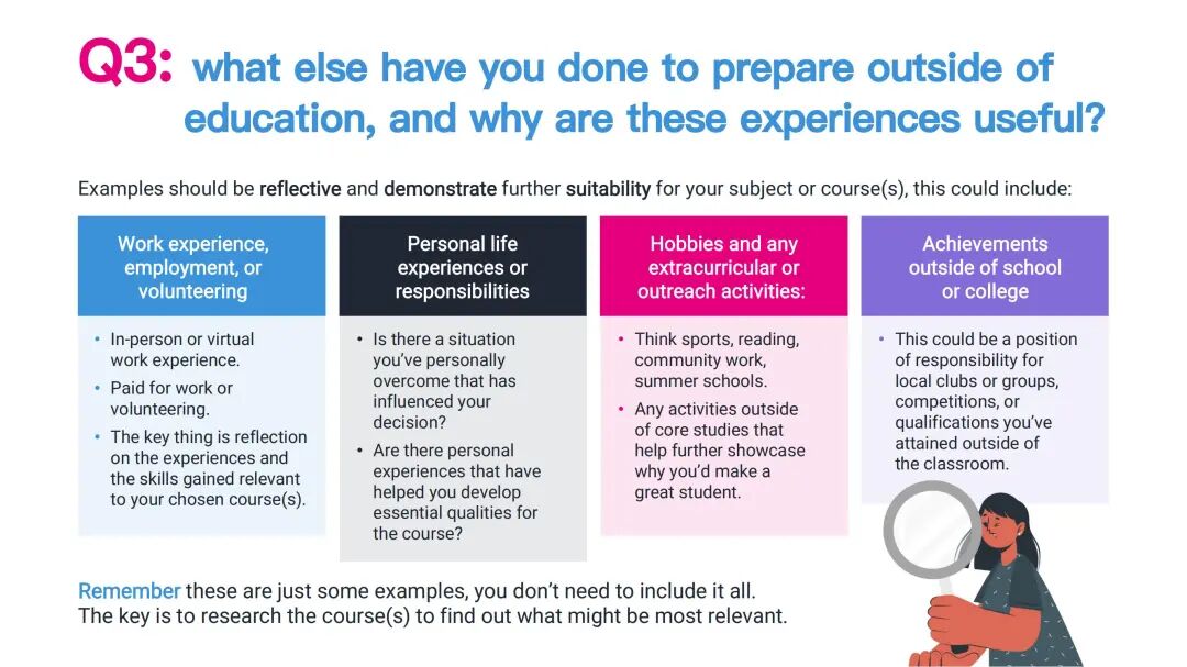 这取决于学生申请的大学或学院以及他们选择的课程。我们建议学生查看申请大学的个人陈述指导和建议。例如,像护理或医学这样的课程会更加重视第三个问题,因为它涉及到工作经验。