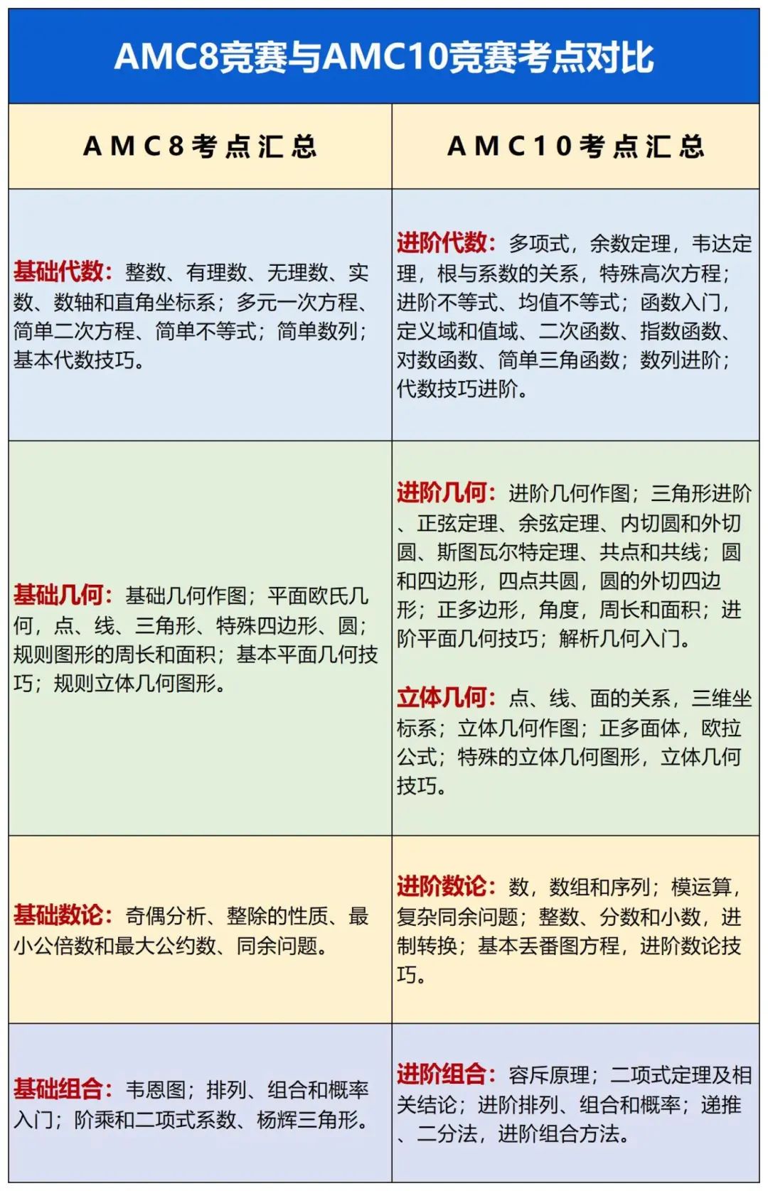 AMC10涉及初等代数、基础几何(勾股定理、面积体积公式等)、初等数论和概率问题。先打好基础,才能应对更高难度