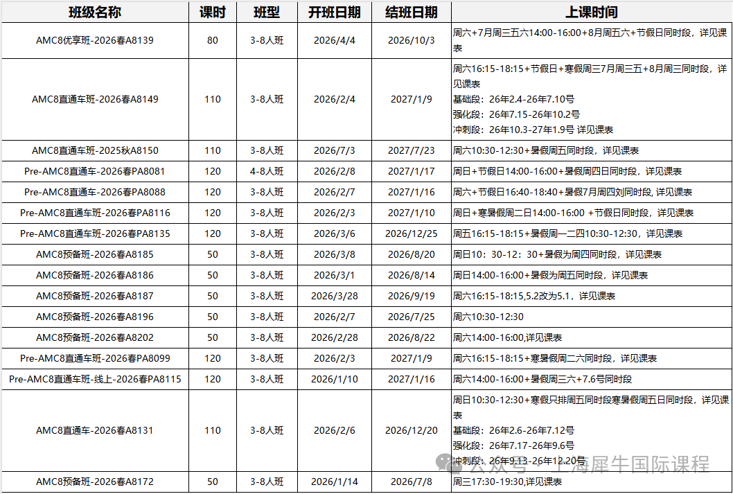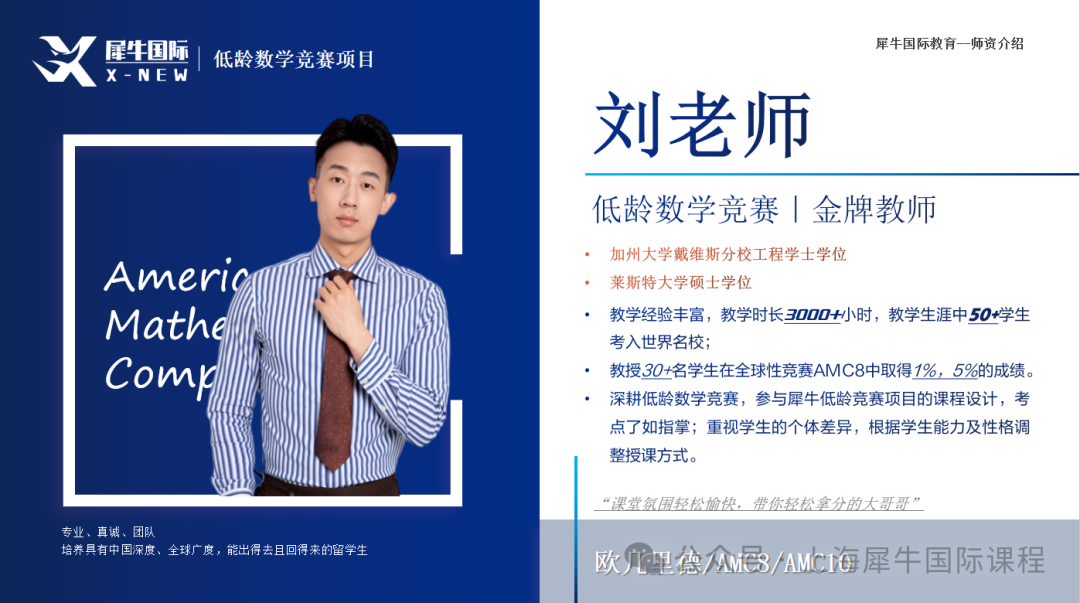 准备备考2027年AMC8的家长们,选对课程,轻松帮助孩子冲刺AMC8前1%,犀牛AMC8培训课程采用科学的分层教学体系,通过入班前测卷精准定位学生基础水平,匹配最适合的班型,就近选择面授课程,也可以选择线上课程,享受总部师资!